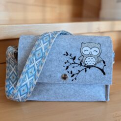 Filz-Handtasche mit: „Eule auf Ast“ – wie am Foto ersichtlich. In verschiedenen Farben und verschiedenen Gurtbändern erhältlich.