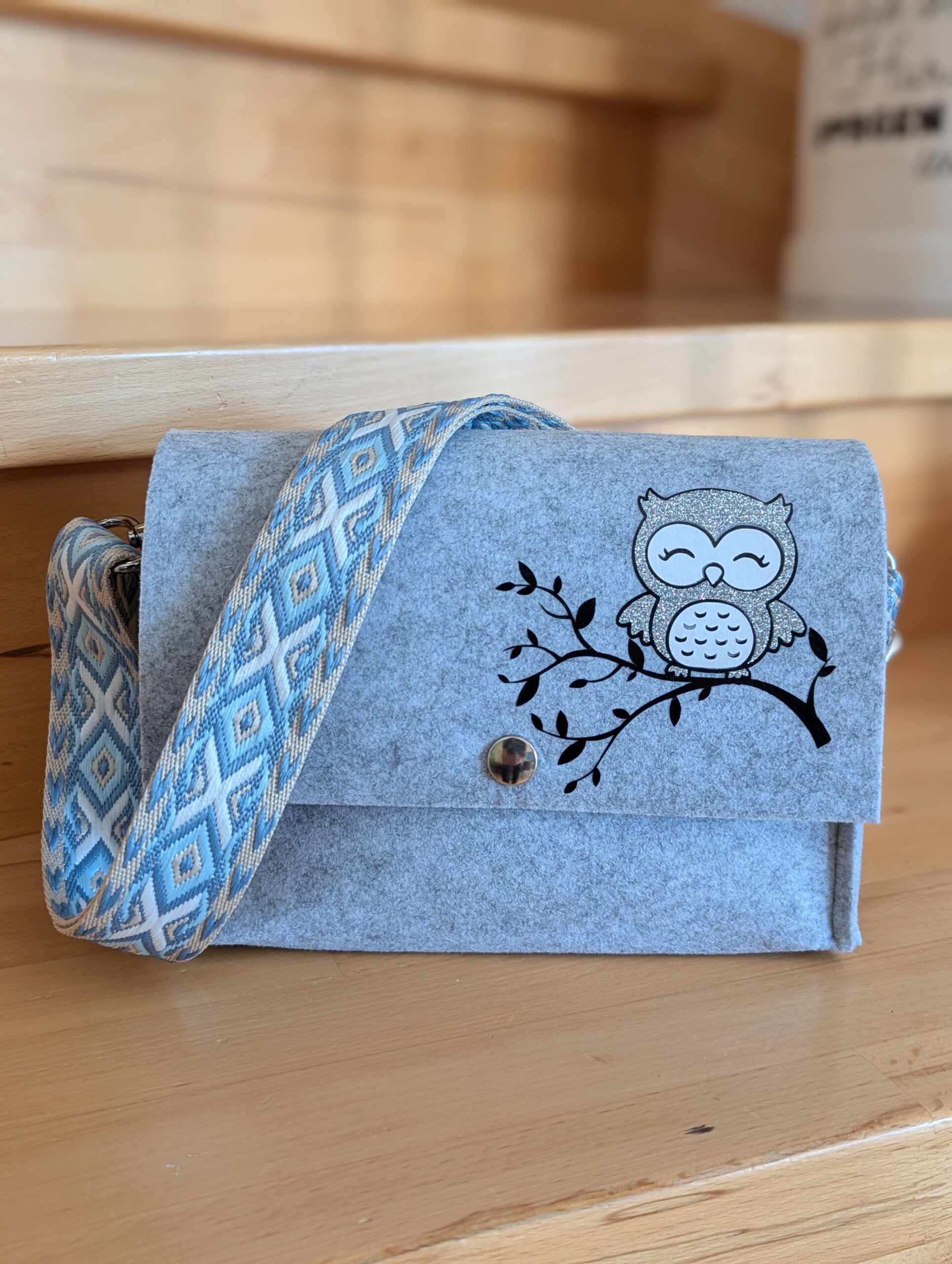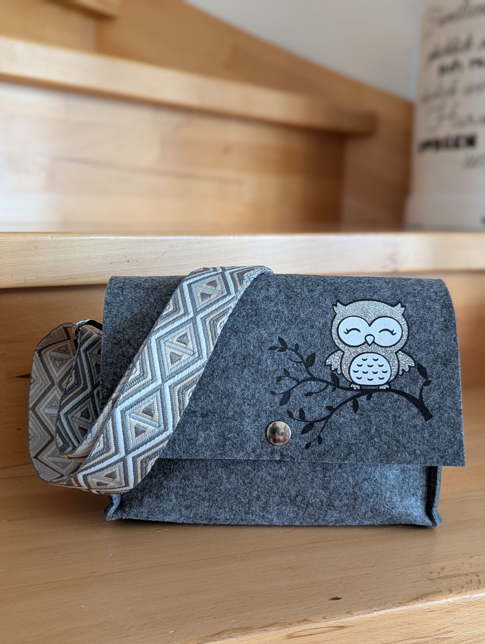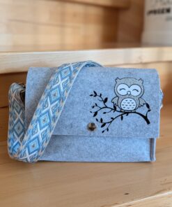 Filz-Handtasche mit: „Eule auf Ast“ – wie am Foto ersichtlich. In verschiedenen Farben und verschiedenen Gurtbändern erhältlich.