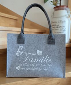 Filz-Tasche mit dem Spruch: „Familie ist alles was wir brauchen um glücklich zu sein!“ – wie am Foto ersichtlich. In verschiedenen Farben und Größen erhältlich.