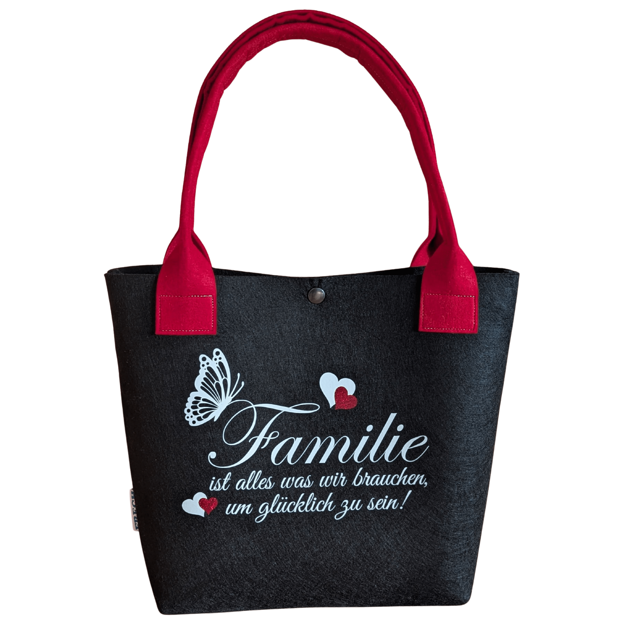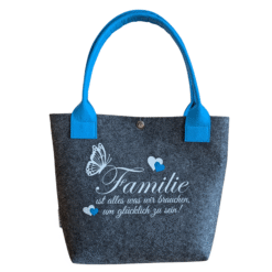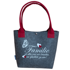 Filz-Shopper mit dem Spruch: „Familie ist alles was wir brauchen um glücklich zu sein!“ – wie am Foto ersichtlich. In verschiedenen Farben erhältlich.