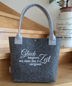 Filz-Shopper mit dem Spruch: „Glück beginnt, wo man die Zeit vergisst.“ – wie am Foto ersichtlich. In verschiedenen Farben erhältlich.