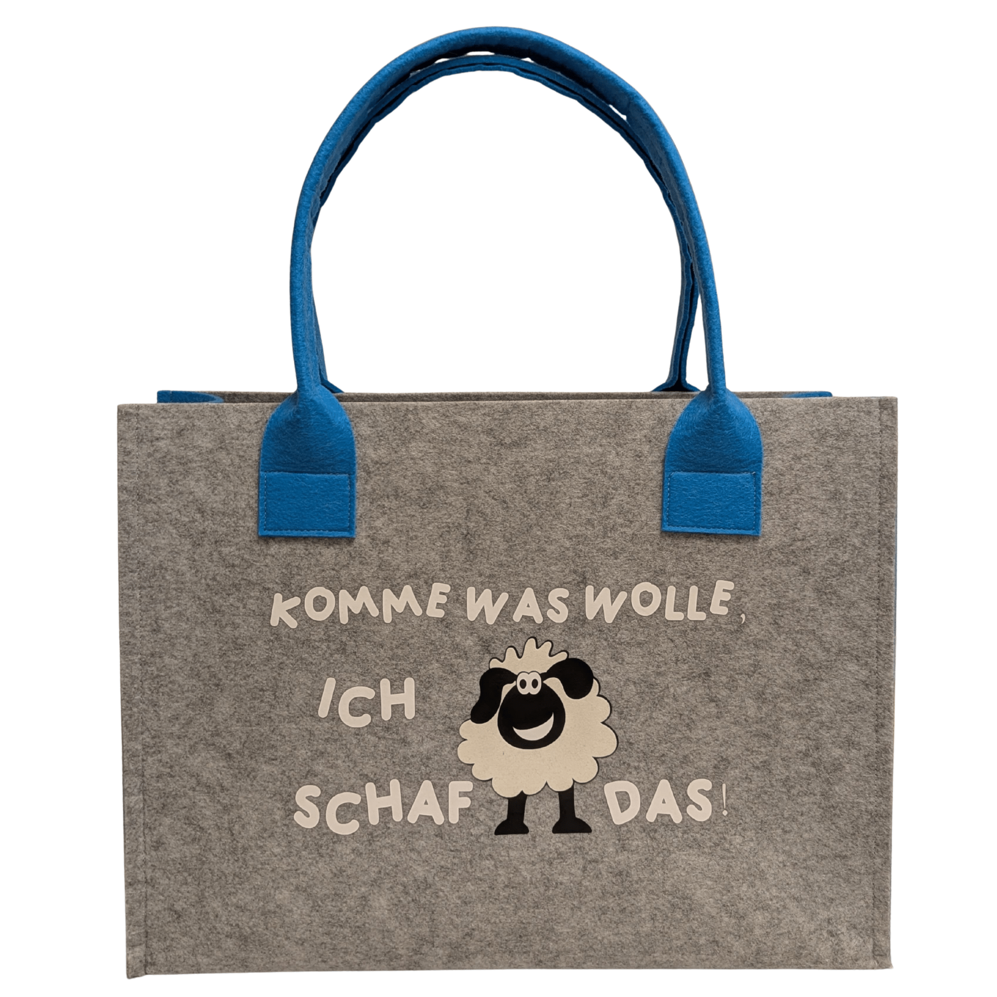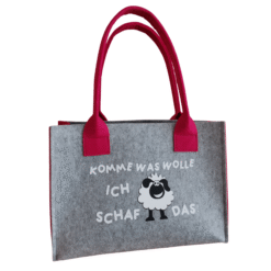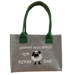 Filz-Tasche mit dem Spruch: „Komme was wolle, ich Schaf das!“ – wie am Foto ersichtlich. In verschiedenen Farben und Größen erhältlich.