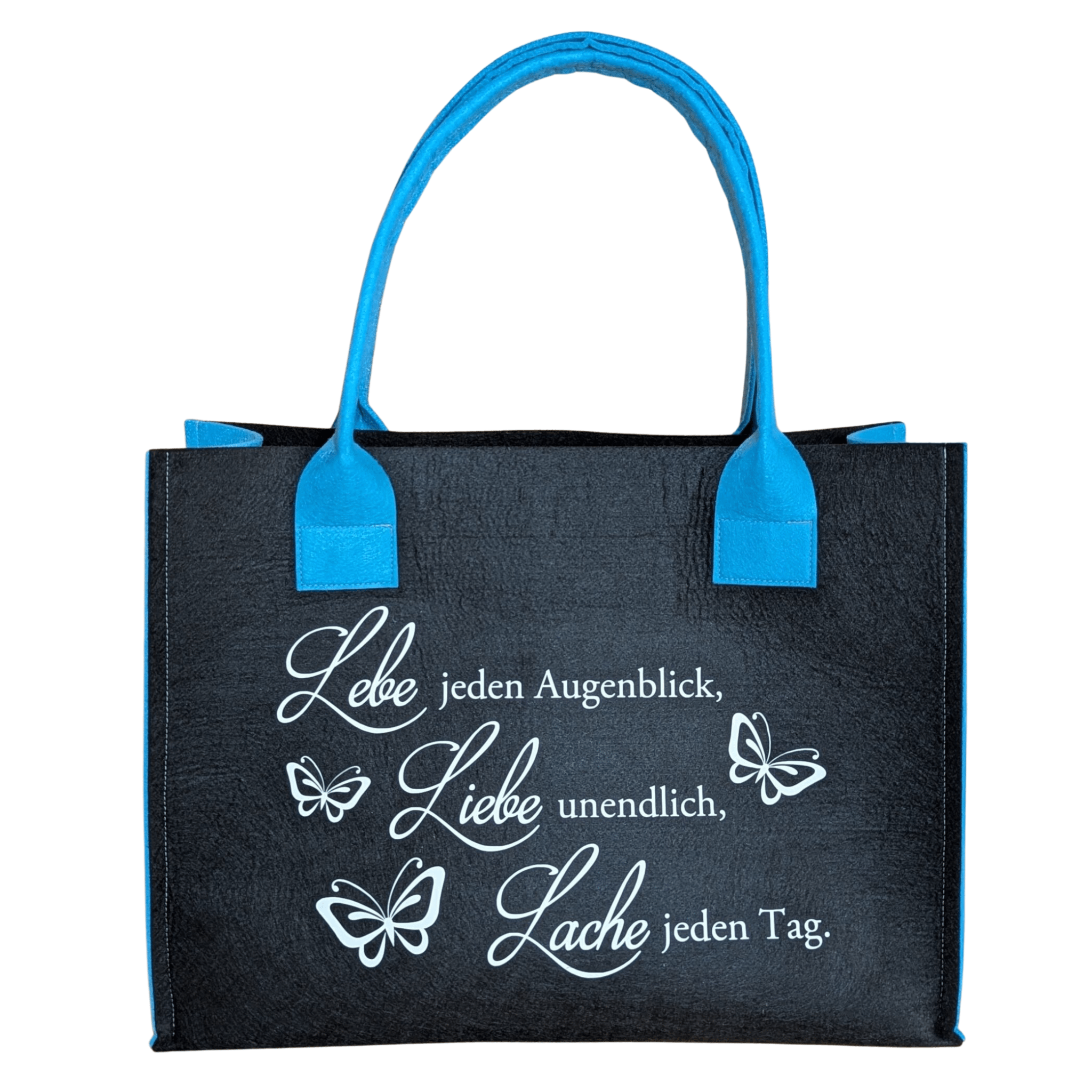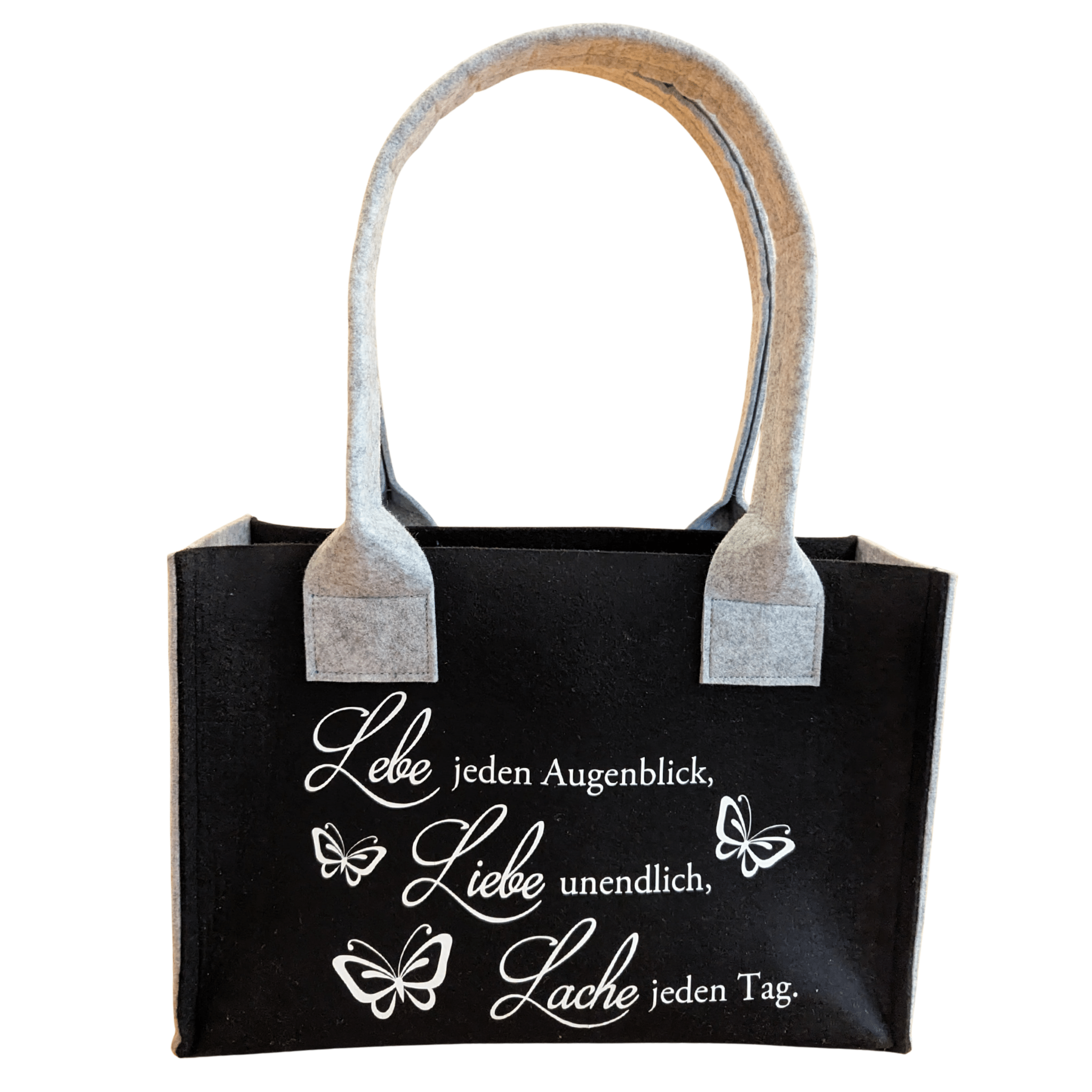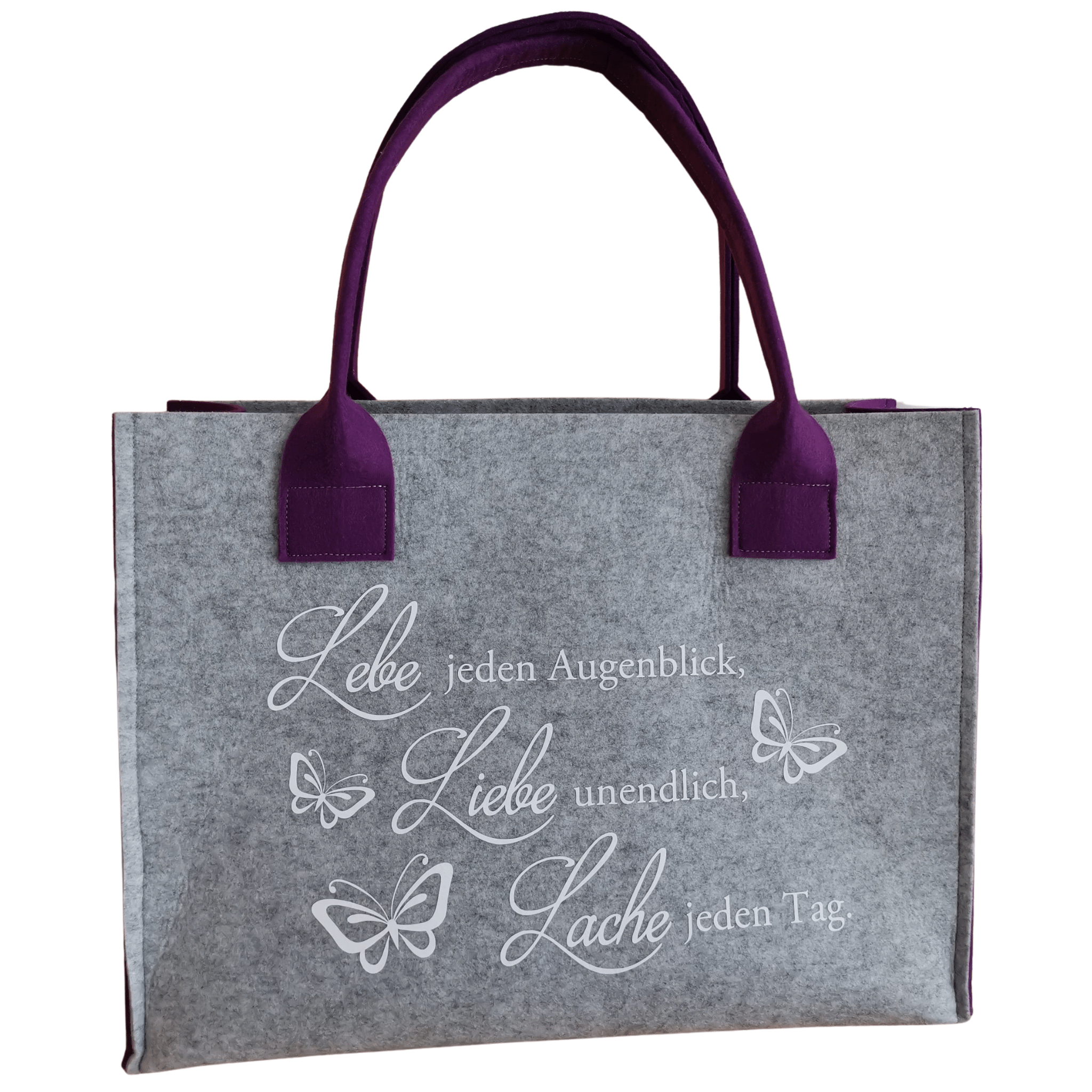 Filz-Tasche mit dem Spruch: „Lebe jeden Augenblick, Liebe unendlich, Lache jeden Tag.“ – wie am Foto ersichtlich. In verschiedenen Farben und Größen erhältlich.