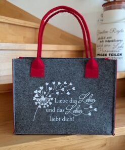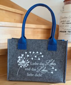 Filz-Tasche mit dem Spruch: „Liebe das Leben und das Leben liebt dich!“ – wie am Foto ersichtlich. In verschiedenen Farben und Größen erhältlich.