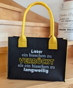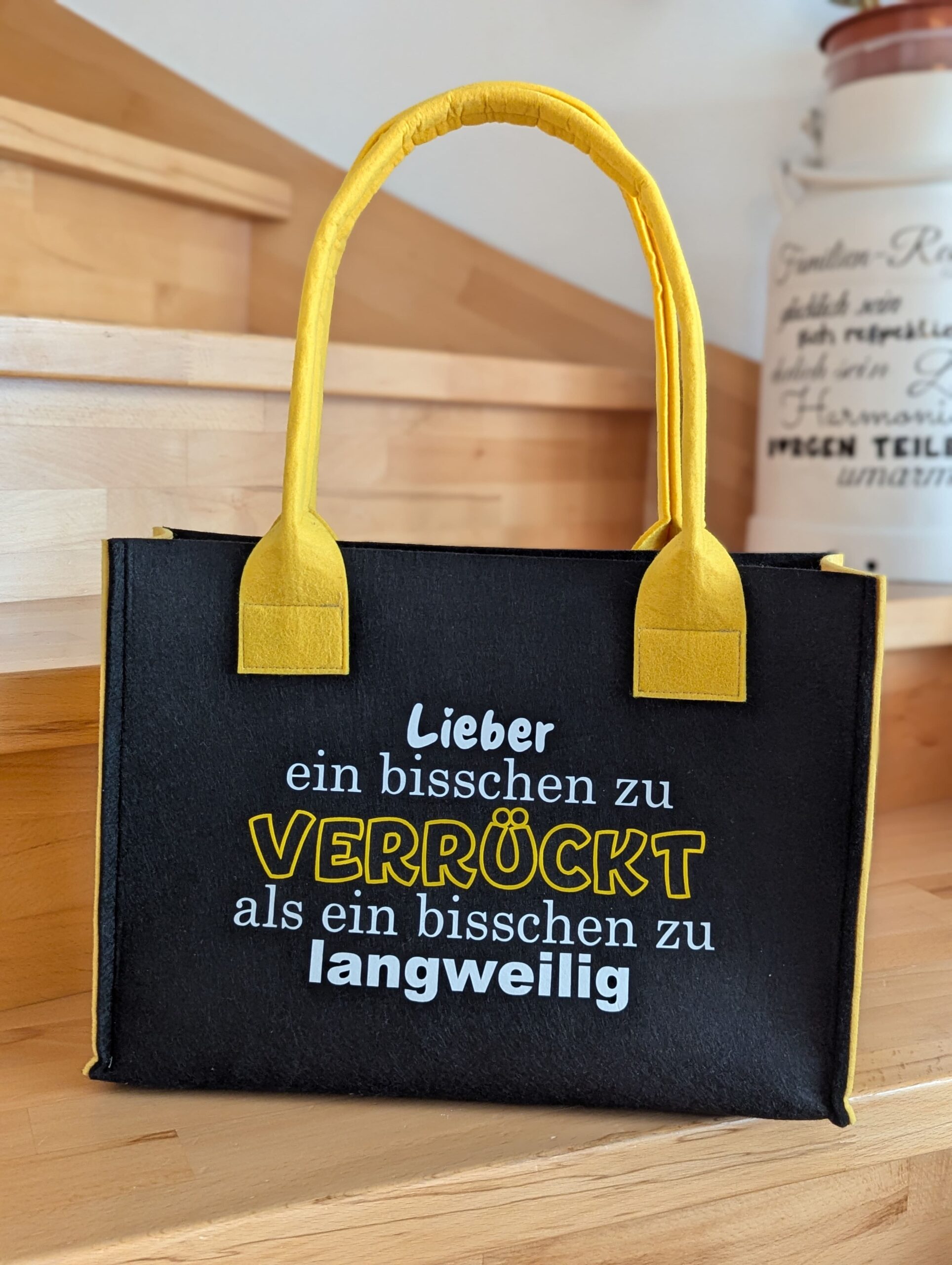 Filz-Tasche mit dem Spruch: „Lieber ein bisschen zu verrückt als ein bisschen zu langweilig“ – wie am Foto ersichtlich. In verschiedenen Farben und Größen erhältlich.