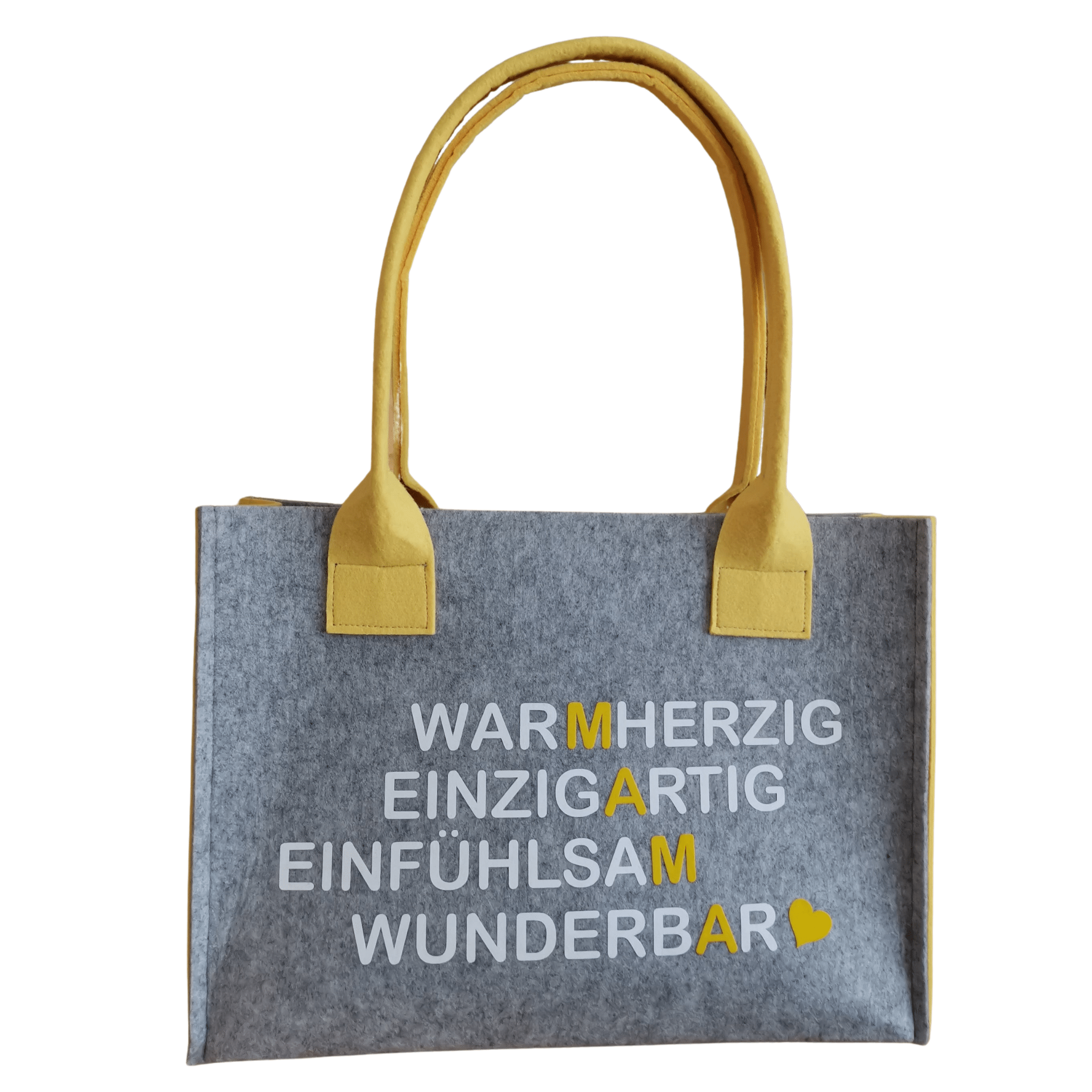 Filz-Tasche mit dem Spruch: „MAMA – warmherzig, einzigartig, einfühlsam, wunderbar“ – wie am Foto ersichtlich. In verschiedenen Farben und Größen erhältlich.