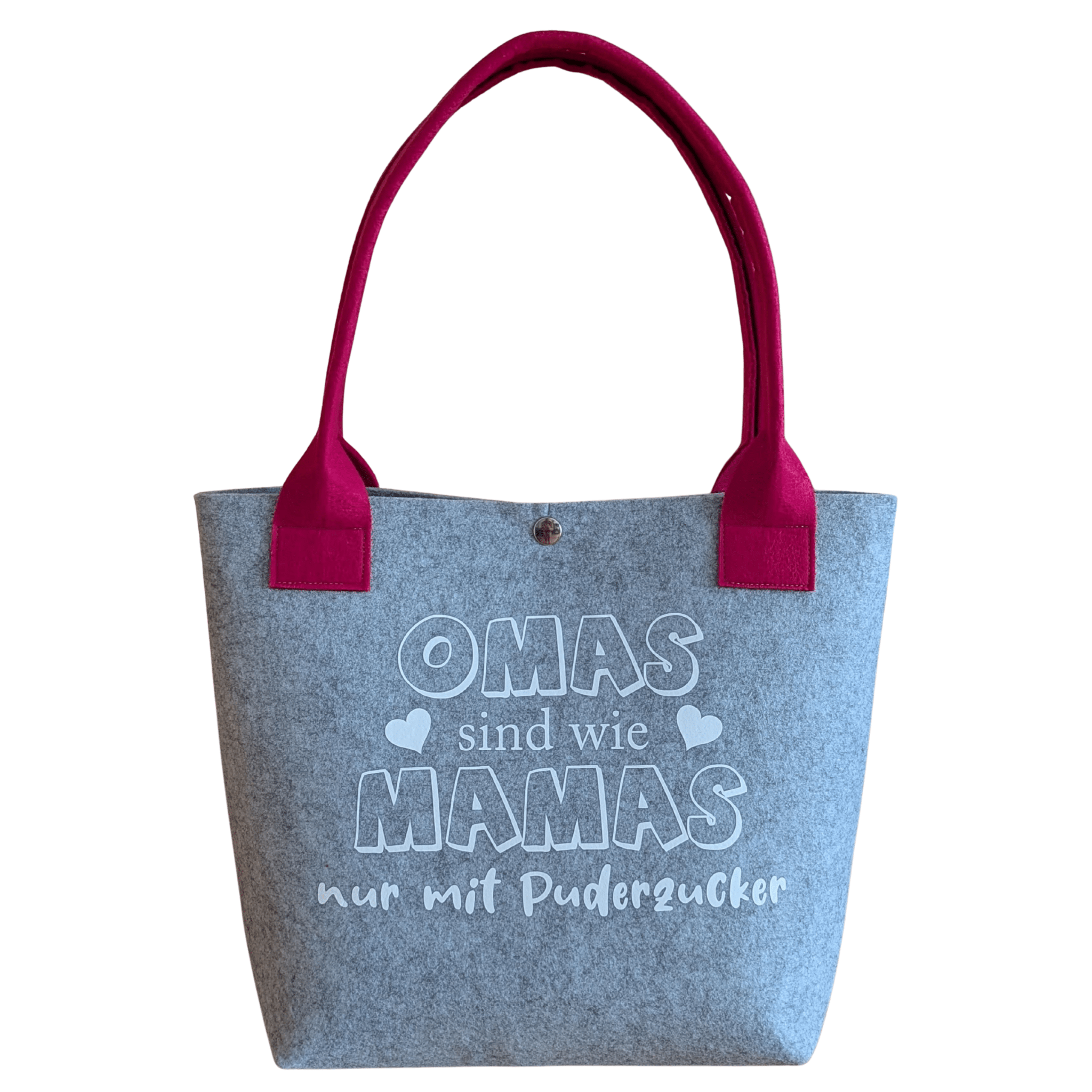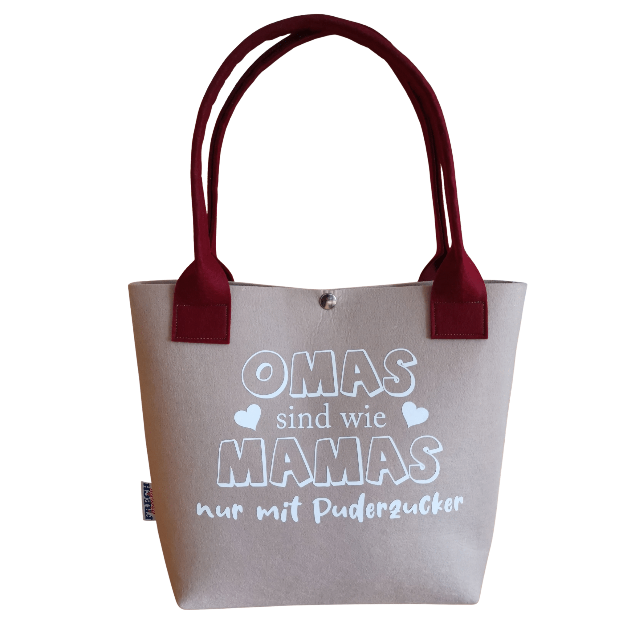 Filz-Shopper mit dem Spruch: „Omas sind wie Mamas nur mit Puderzucker“ – wie am Foto ersichtlich. In verschiedenen Farben erhältlich.