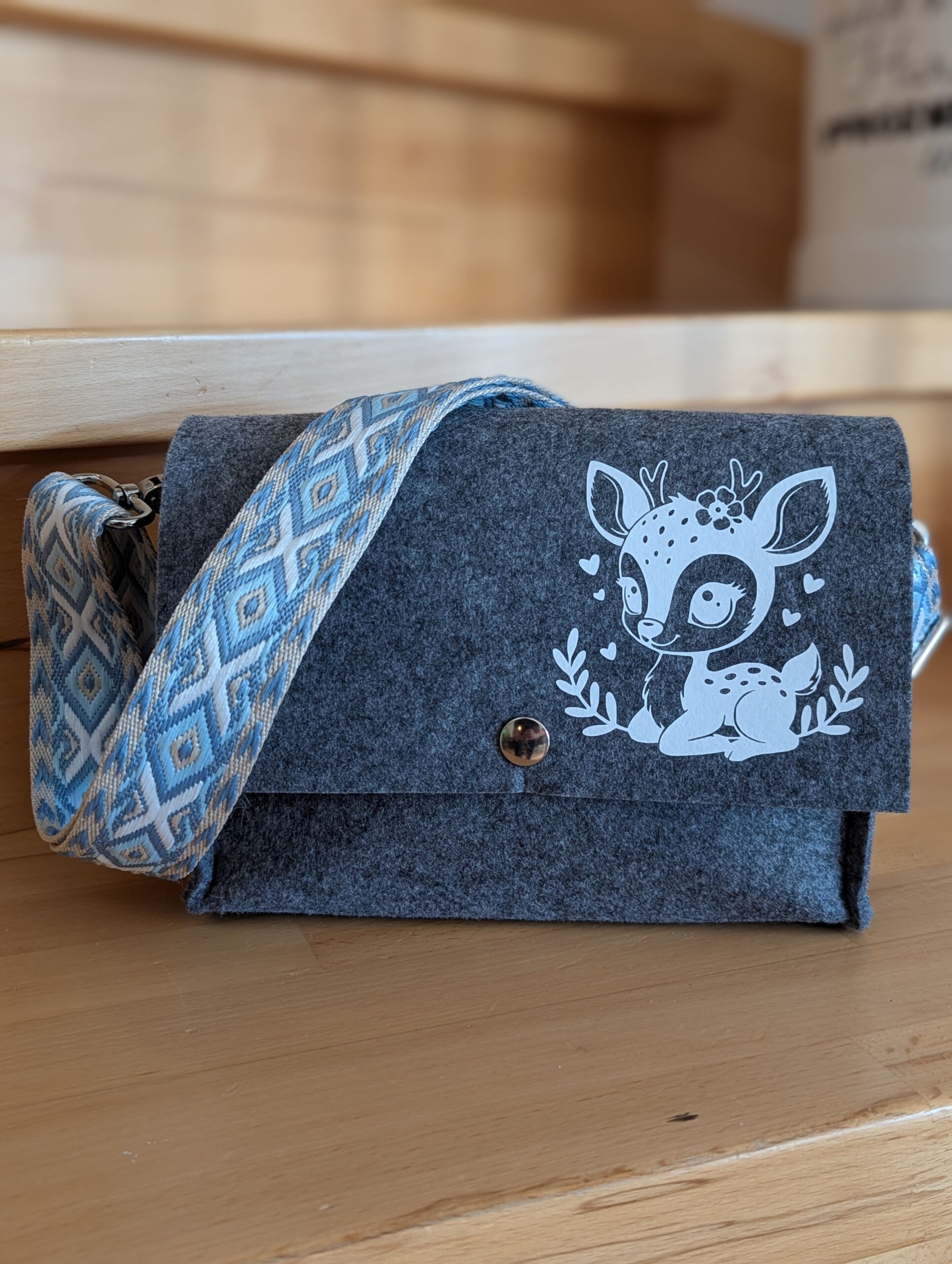 Filz-Handtasche mit: „Rehkitz“ – wie am Foto ersichtlich. In verschiedenen Farben und verschiedenen Gurtbändern erhältlich.