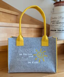 Filz-Tasche mit dem Spruch: „Sonne im Herzen und Blödsinn im Kopf“ – wie am Foto ersichtlich. In verschiedenen Farben und Größen erhältlich.