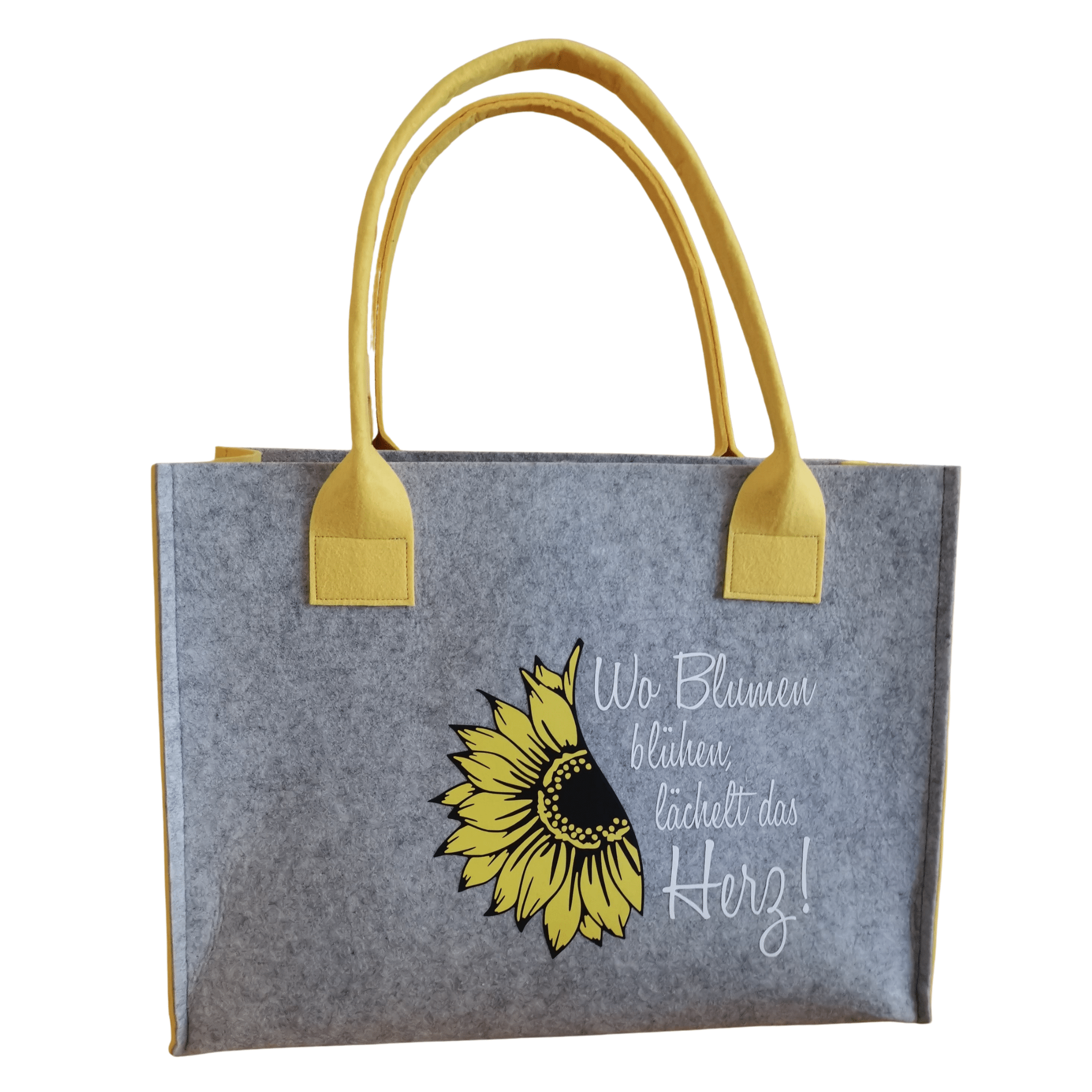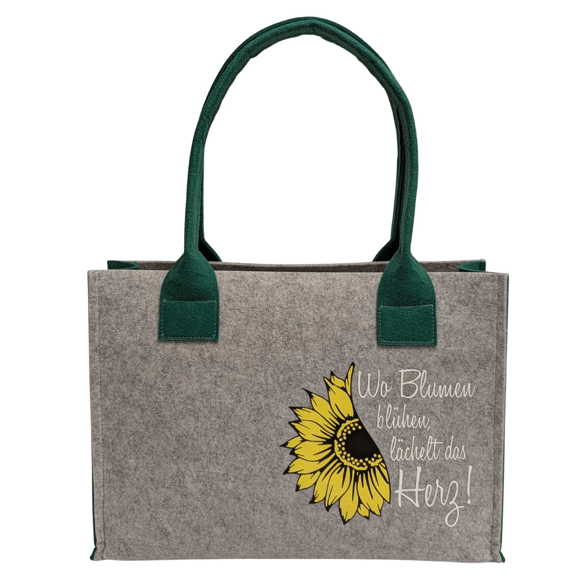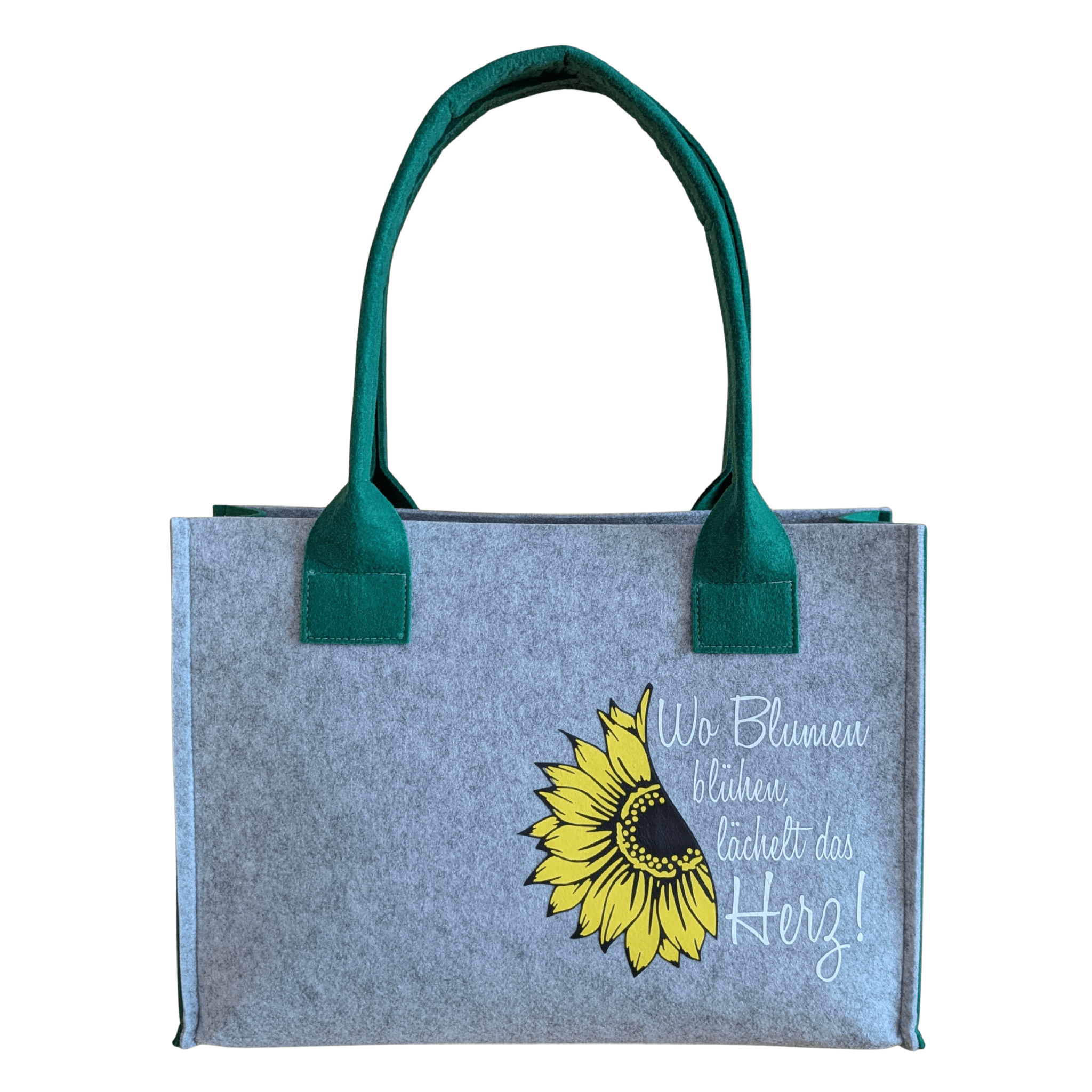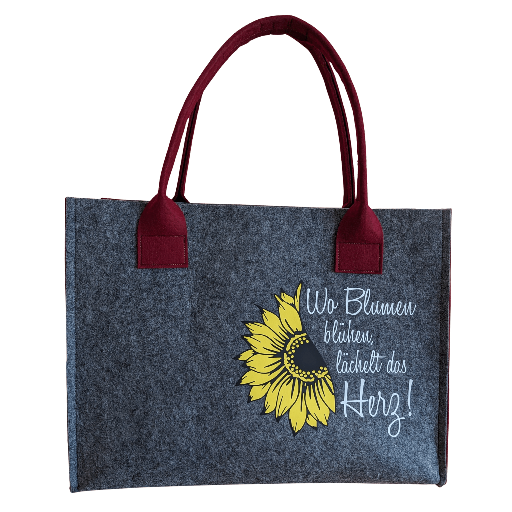 Filz-Tasche mit dem Spruch: „Wo Blumen blühen lächelt das Herz!“ – wie am Foto ersichtlich. In verschiedenen Farben und Größen erhältlich.